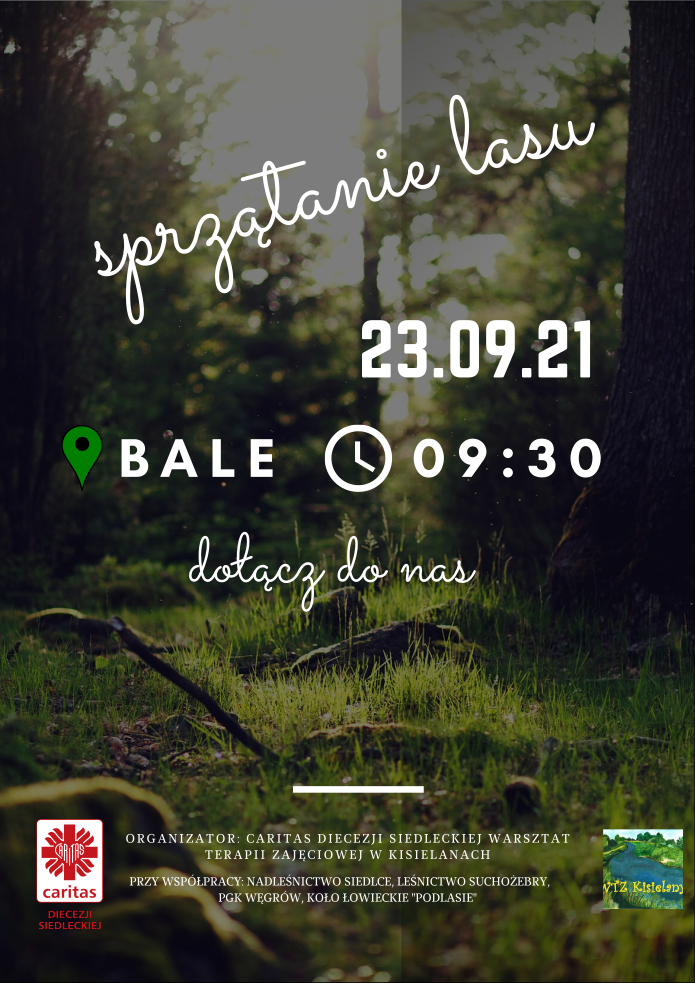 Czy lasy, które nas otaczają, wymagają sprzątania? Grupa osób z niepełnosprawnościami – podopiecznych Warsztatu Terapii Zajęciowej w Kisielanach i innych placówek Caritas Diecezji Siedleckiej - sprawdzi to w praktyce. Spotkają się oni 23 września 2021 r. o godz. 9:30 przy domku myśliwskim Koła Łowieckiego „Podlasie” w Balach (przy drodze nr 696), by wziąć udział w akcji #sprzatanielasu na terenie Powiatu Siedleckiego – Gminy Mokobody. Porządkom patronuje św. Franciszek z Asyżu.