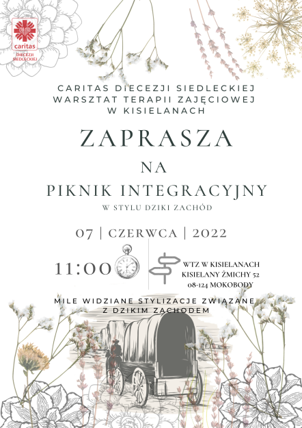 Niepełnosprawni uczestnicy placówek z diecezji siedleckiej, warszawsko-praskiej i drohiczyńskiej spotkają się już kolejny raz na Pikniku Integracyjnym, organizowanym przez Caritas Diecezji Siedleckiej Warsztat Terapii Zajęciowej w Kisielanach. Impreza w stylu „Dziki Zachód” z zabawami animacyjnymi z grupą „Niebanalne animacje”, odbędzie się 7 czerwca 2022 r. o godz. 11:00 w Kisielanach Żmichach 52 na terenie placówki.