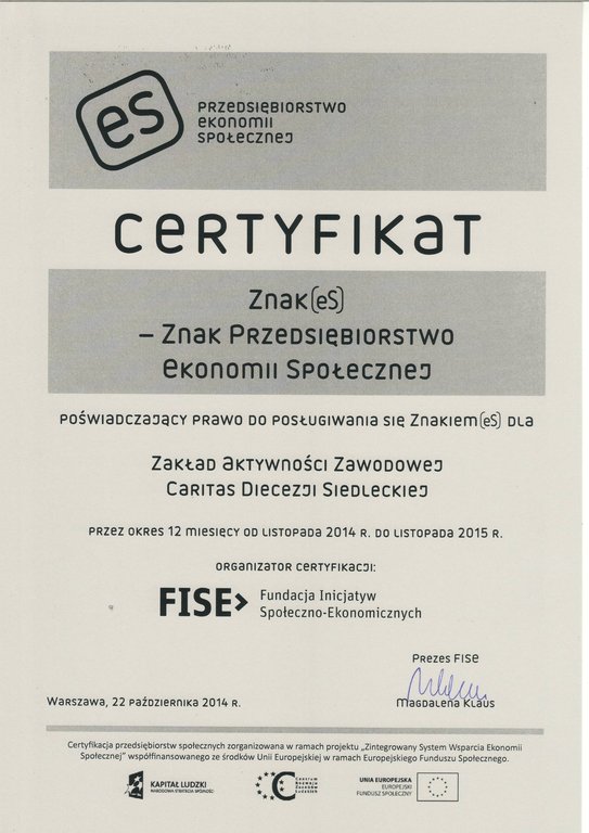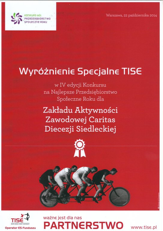 Zakład Aktywności Zawodowej Caritas Diecezji Siedleckiej został laureatem tego konkursu o zasięgu ogólnokrajowym i otrzymał wyróżnienie specjalne TISE oraz prestiżowy certyfikat Znak Przedsiębiorstwo Ekonomii Społecznej - Znak [eS].