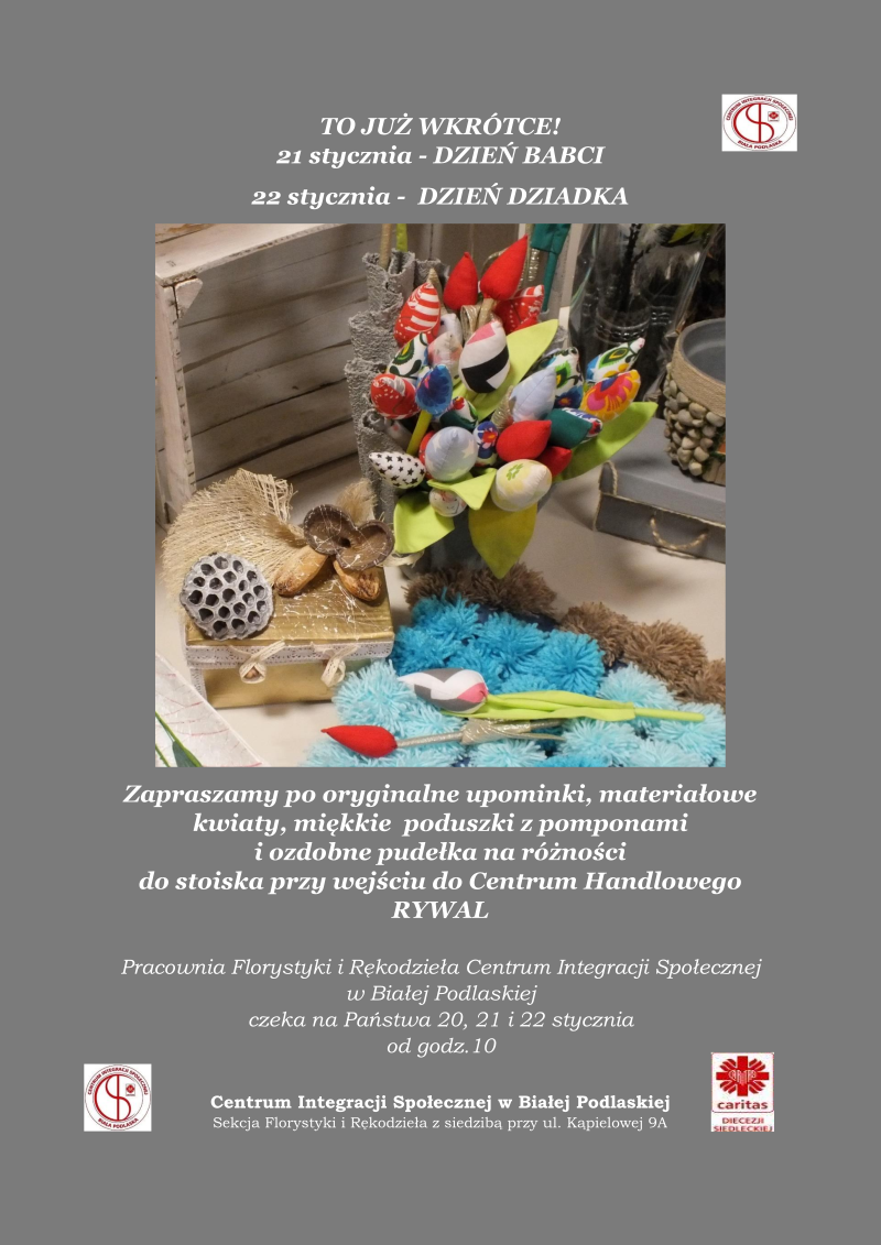 Rękodzieło na Dzień Babci i Dziadka przygotowali uczestnicy dwóch placówek Caritas Diecezji Siedleckiej - Centrów Integracji Społecznej w Siedlcach i Białej Podlaskiej. Prace będzie można kupić podczas kiermaszów.