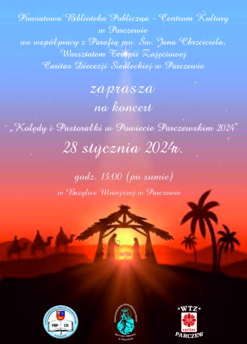Powiatowa Biblioteka Publiczna - Centrum Kultury w Parczewie we współpracy z Parafią pw. Św. Jana Chrzciciela i Warsztatem Terapii Zajęciowej Caritas Diecezji Siedleckiej w Parczewie zaprasza na koncert „Kolędy i Pastorałki w Powiecie Parczewskim 2024” 28 stycznia 2024 r. godz. 13:00 (po sumie) w Bazylice Mniejszej w Parczewie.