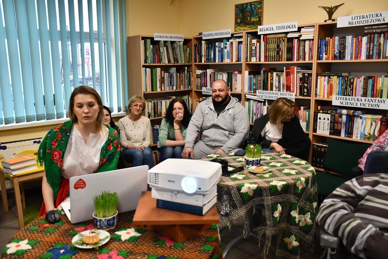 Spotkanie, zorganizowane w przepięknej scenerii stylizowanej na domy naszych dziadków, miało przybliżyć zwyczaje i obyczaje związane ze Świętami Wielkanocnymi. Poprowadziły je: Panie Ewelina Rudkowska - dyrektor biblioteki oraz Elżbieta Jarosz – animator kultury, które ubrały na siebie stroje ludowe, nawiązujące do kultury regionu.