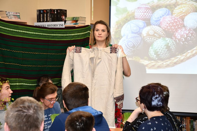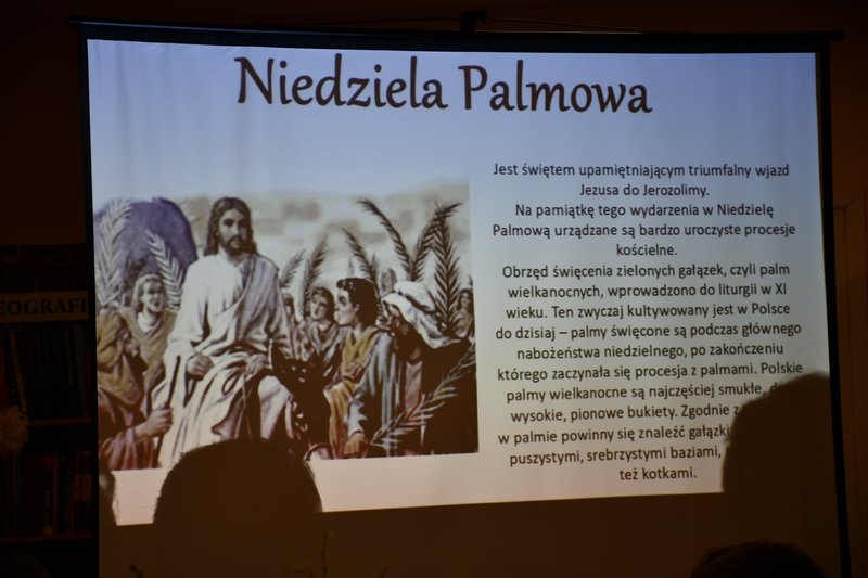 Po krótkiej prezentacji omówiono zwyczaje związane z Wielkanocą: tradycję malowania pisanek, święcenia pokarmów, kręcenia palm oraz przygotowywania pokarmów świątecznych.