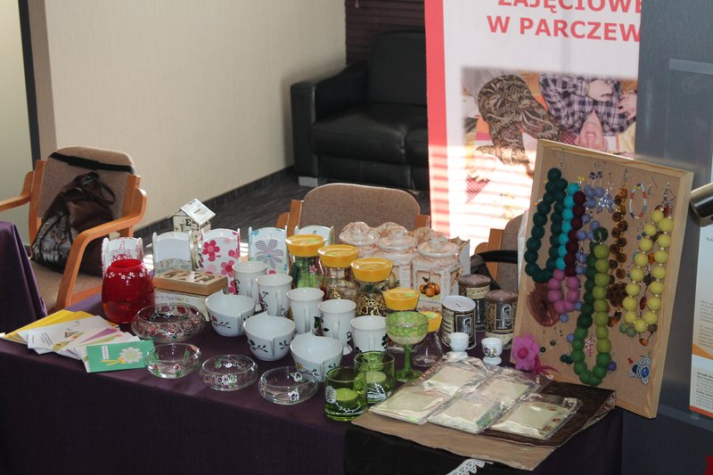 Podczas konferencji WTZ Parczew wyeksponował prace podopiecznych powstałe w ramach prowadzonej terapii: biżuterię, szkło użytkowe i dekoracyjne ręcznie malowane i zdobione techniką decoupage czy kartki okolicznościowe.