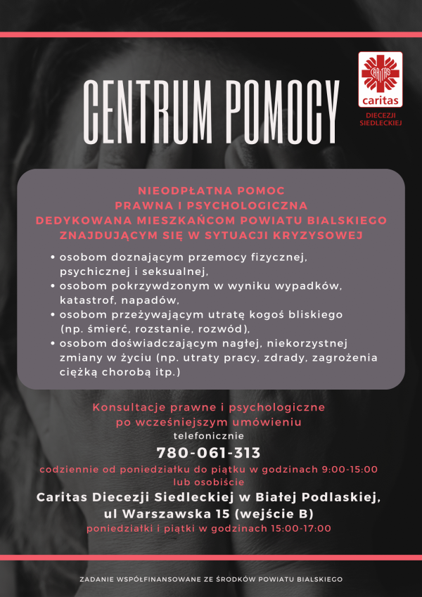 Osoby w kryzysie, poszukujące wsparcia, od teraz mogą w jednym miejscu uzyskać profesjonalną pomoc. Centrum Pomocy w Białej Podlaskiej, prowadzone przez Caritas Diecezji Siedleckiej, od 1 marca 2024 r. oferuje im bezpłatną pomoc prawną i psychologiczną. Ze wsparcia mogą korzystać mieszkańcy powiatu bialskiego.