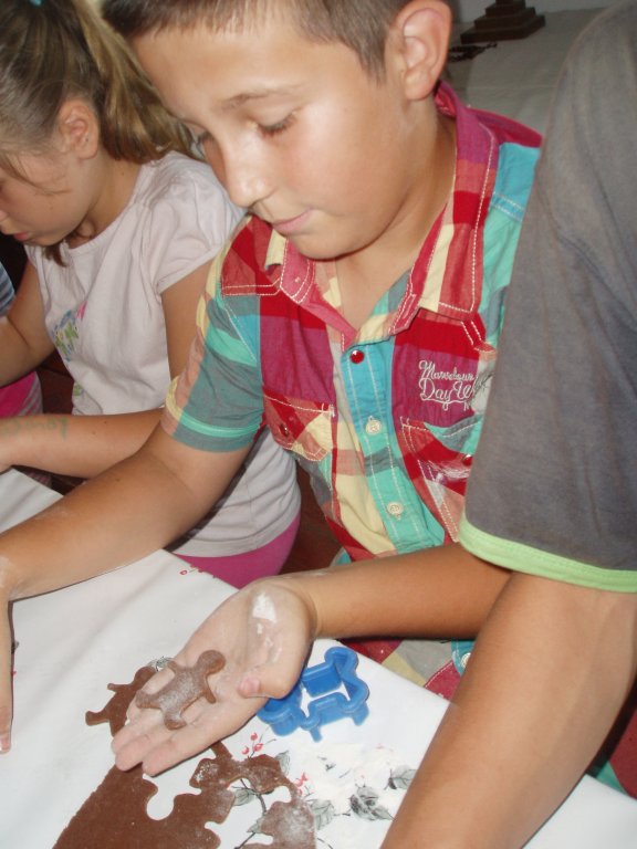 Pierwszy dzień przygody w „Krainie rumianku” rozpoczęliśmy na słodko. Na wstępie Pani Mirka opowiedziała nam historię toruńskich pierników zwanych „katarzynkami”. Legendy opisują, iż Mikołaj Czan, pracując u pewnego piekarza, przez przypadek wynalazł pierniki. Pewnego dnia Mikołaj poczuł się bardzo źle i chciał pójść do domu, ale majster stanowczo nie zgodził się, gdyż trzeba było upiec dużo chleba. Młody czeladnik został, ale praca szła mu wyjątkowo opornie i pech chciał, że zamiast wody przez pomyłkę dodał do ciasta miodu. Przerażony stwierdził, że ciasto pociemniało i stało się słodkie. Wszystko jednak zakończyło się dobrze, gdyż w przypływie fantazji powykrawał z ciasta różne śmieszne figurki i upiekł w piecu -i tak powstały pierniki.