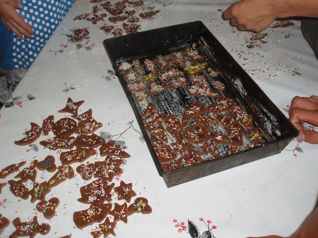 Zaraz po tym zabraliśmy się do pracy. Każdy z nas dostał kawałek ciasta piernikowego. W ruch poszły wałki i przeróżnych kształtów foremki. Już po paru minutach na stołach pojawiły się piernikowe cudeńka. Choć ciasto było jeszcze surowe, to nie jeden z nas nie oparł się pokusie i je skosztował. Po tym przyszedł czas na udekorowanie naszych gwiazdek, serduszek, samochodzików... do tego posłużyły nam ziarenka maku i sezamu, rodzynki, cukier oraz kolorowa posypka (ciesząca się największym wzięciem). W przygotowanie smakołyków zaangażowani byli dosłownie wszyscy. Nawet Panie Gosia i Martyna otrzymały swoje foremki z których powstały piernikowe ludki. Wystarczyło tylko wstawić nasze ciasteczka do pieca, ale tym zajęły się już Panie, prowadzące te zajęcia. Po kilkudziesięciu minutach kolorowe pierniki czekały aby je zjeść lub zabrać do domu i podzielić się z najbliższymi.