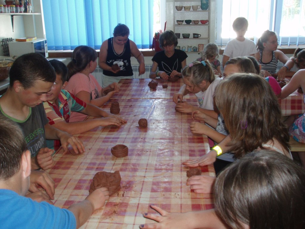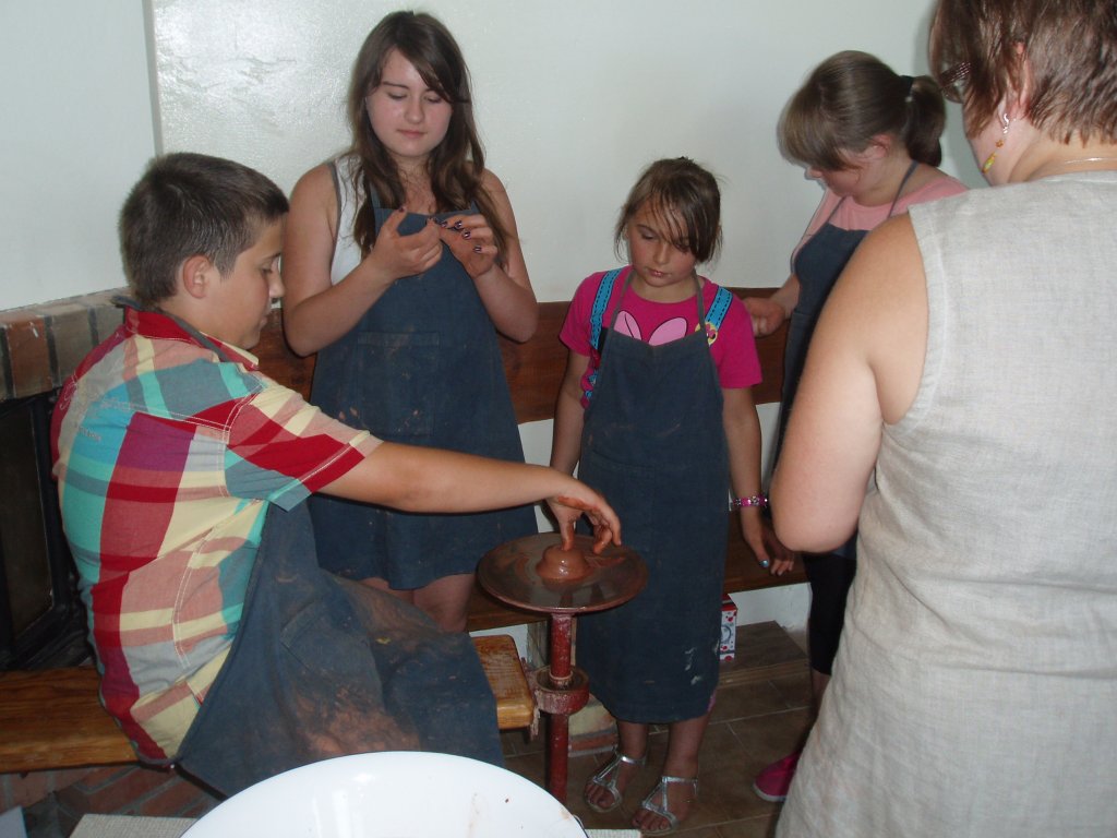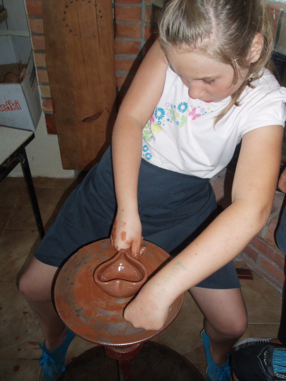 Kolejnymi zajęciami tego dnia, były warsztaty lepienia z gliny. Tu poznaliśmy wszystkie etapy przygotowania i formowania gliny na kole garncarskim. Wypróbowaliśmy trzy techniki: wałeczkową, miseczkową, toczenia na kole. Każdy zrealizował swój pomysł na gliniane naczynia bądź rzeźby. Powstało mnóstwo miseczek, dzbanuszków oraz doniczek. Wszyscy z dłońmi umazanymi w glinie dobrze się bawiliśmy.